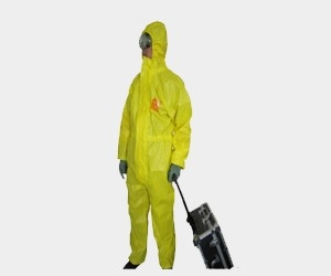 亮黃色,連體帶帽,松緊帽檐、腰部、袖口和褲管。外置型聚氨酯耐磨底鞋套(另配)。后背有“警察POLICE”字樣,獨特的超聲波焊接加黏膠條技術使接縫更加牢固密封。外層的阻隔膜可以出色地防護100多種化學品和生物有害物。雙層拉鏈以及雙層門襟確保了衣服的密封性。雙層袖管確保了手套與衣服連接處的液密性。衣服纖維不脫落以保護犯罪現(xiàn)場。該款服裝是當前世界上可重復使用的比較輕盈的防護服。